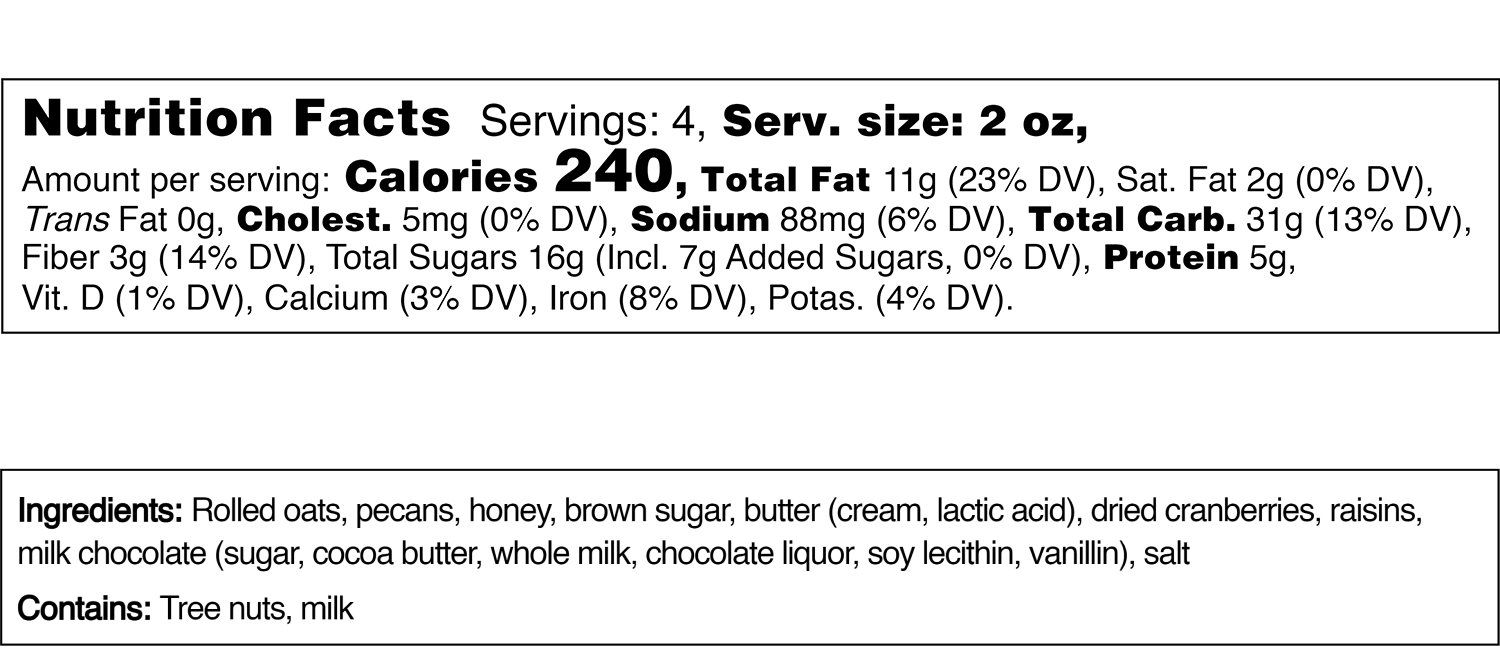 The granola that started the whole craze! This chewy treat combines oats, raisins, cranberries, and pecans for a healthy but sweet snack. While still warm, chocolate is added to the mixture, melting over every bite!